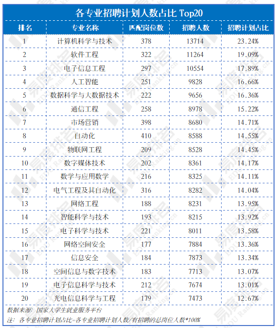 正在聘请打算占比Top20中,消息手艺大类专业(包罗计较机、软件、电子消息、人工智能、大数据、通信、物联网等)占领了绝对从导地位,包办了前6名以及榜单中的绝大大都席位。排名第一的计较机科学取手艺,其打算招录人数占到了统计总盘子的23。24%。消息传输、软件和消息手艺办事业做为薪酬和预算的“双冠王”,其增加间接为对相关专业结业生集群式、规模化的聘请需求;从动化正在笼盖率排名第一(最广)的根本上,其打算聘请人数仍然高居前列,占比超14%。
