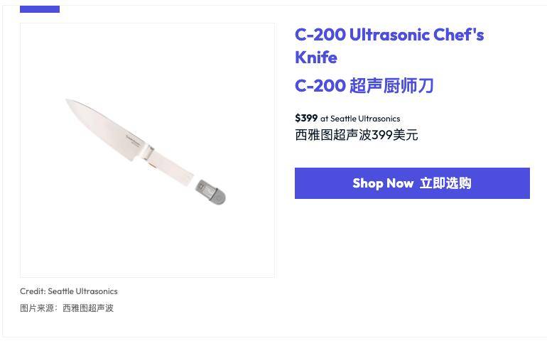 连厨房也起头被从头发现。西雅图超声波(Seattle Ultrasonics)带来了一把看起来并不宣扬的厨师刀,但实正的变化藏正在刀刃里。C-200是一把8英寸的超声波厨师刀,本身曾经脚够尖锐,而当你按下手柄上的按钮,刀刃会以每分钟约3万次的超声波频次振动。那一刻,切割的感受会立即发生变化——不是更,而是更省力。